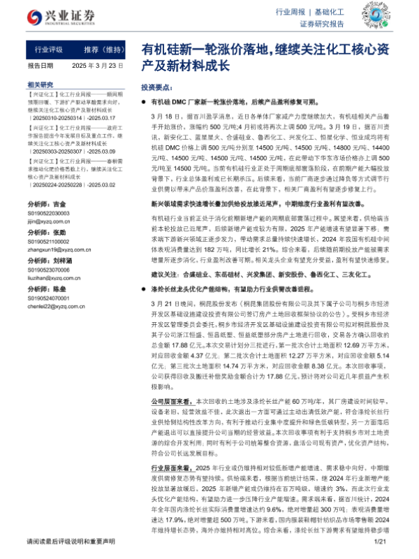 【兴业证券】【20250323】20250323-兴业证券-基础化工行业周报:有机硅新一轮涨价落地,继续关注化工核心资产及新材料成长-21页