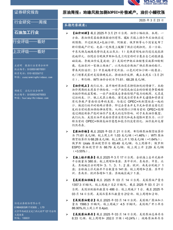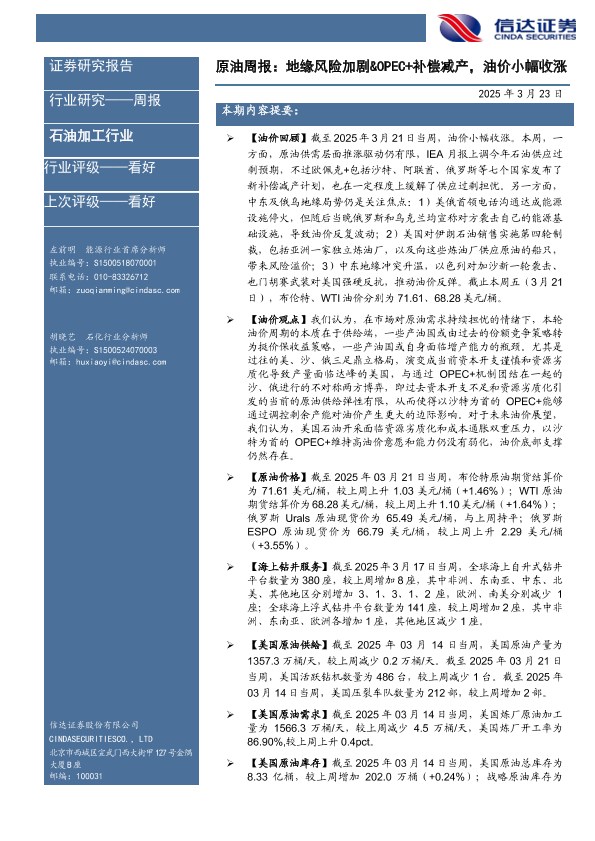 【信达证券】【20250323】原油周报:地缘风险加剧&OPEC+补偿减产,油价小幅收涨-27页
