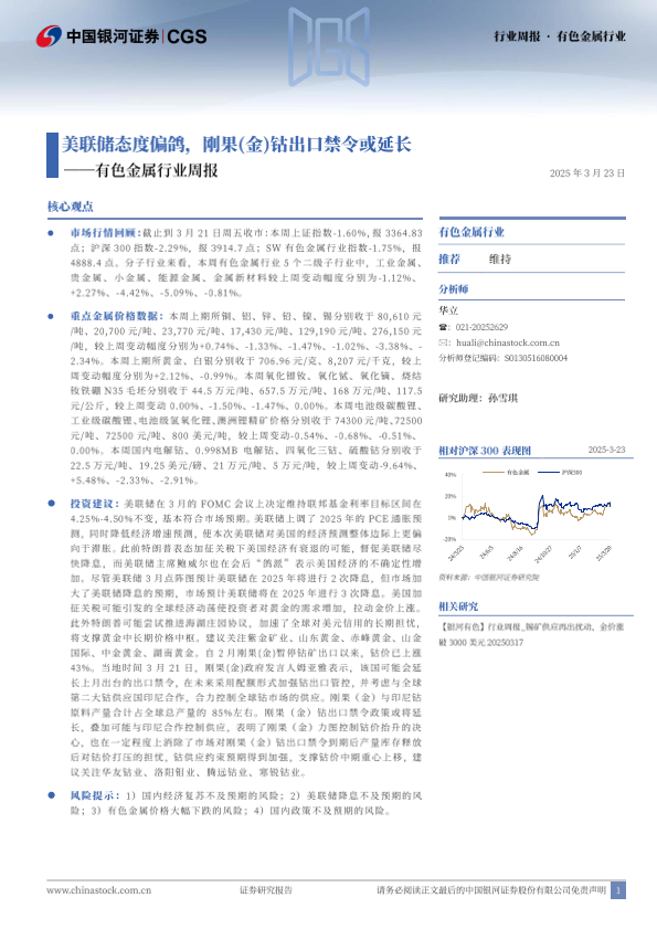 【银河证券】【20250323】20250323-中国银河-有色金属行业周报:美联储态度偏鸽,刚果(金)钴出口禁令或延长-20页