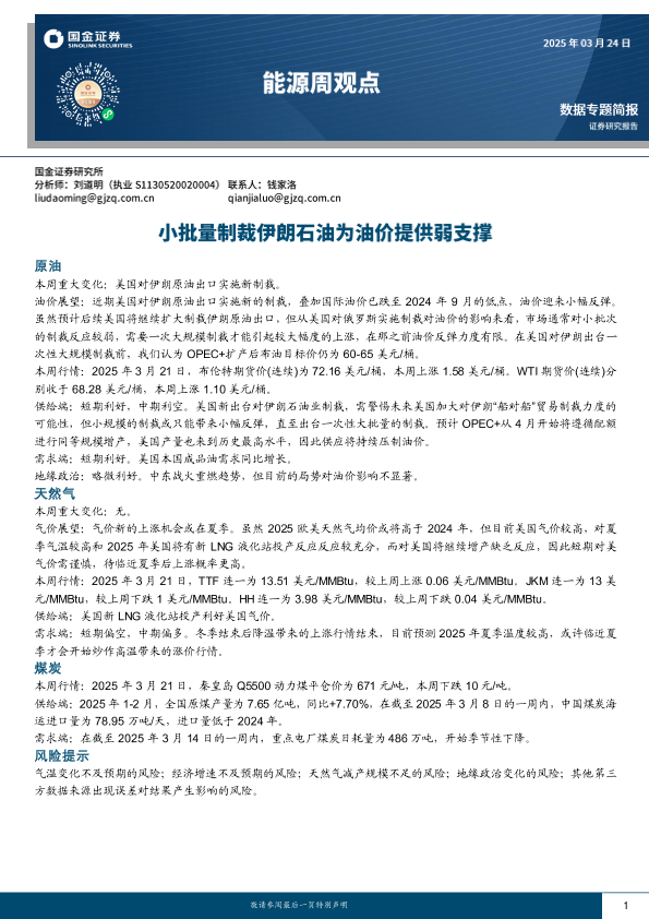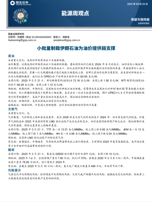 【国金证券】【20250324】能源周观点:小批量制裁伊朗石油为油价提供弱支撑-12页