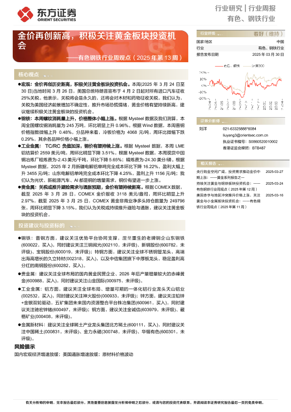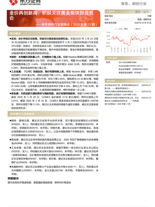 【东方证券】【20250330】2025年第13周有色钢铁行业周观点:金价再创新高,积极关注黄金板块投资机会-26页