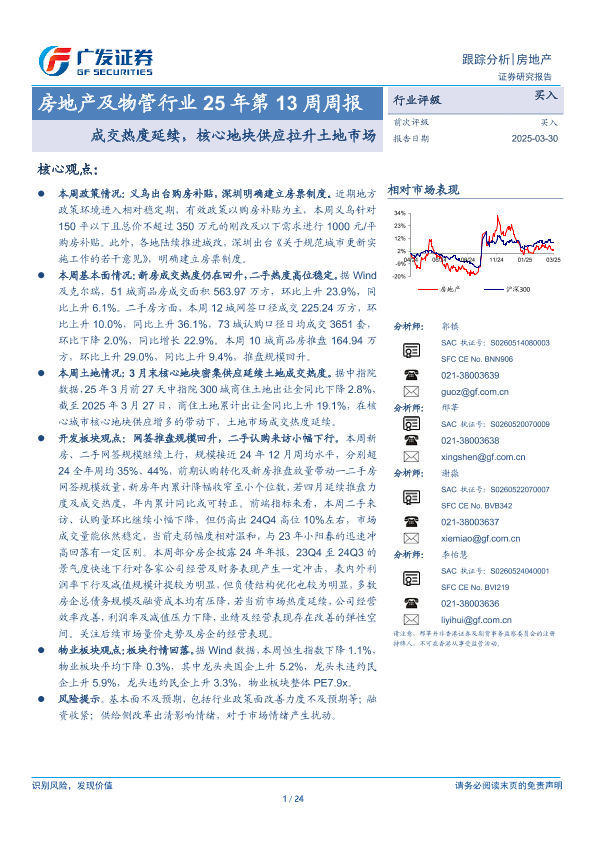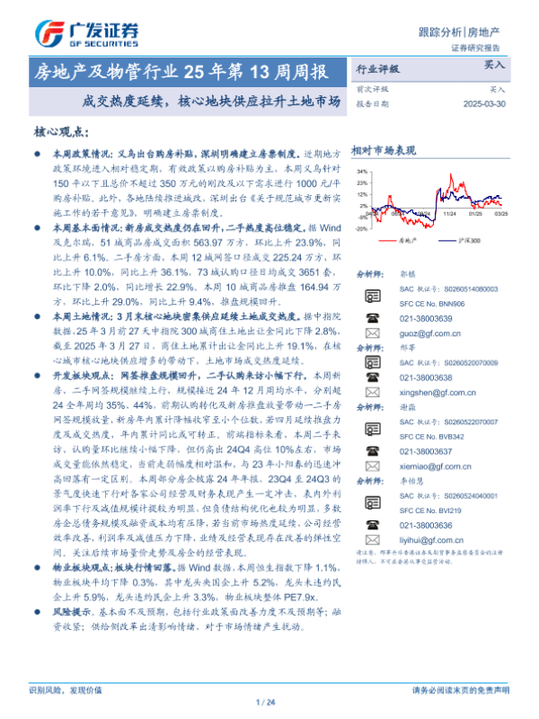 【广发证券】【20250330】房地产及物管行业25年第13周周报:成交热度延续,核心地块供应拉升土地市场-24页