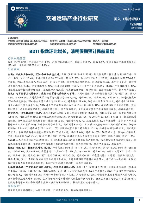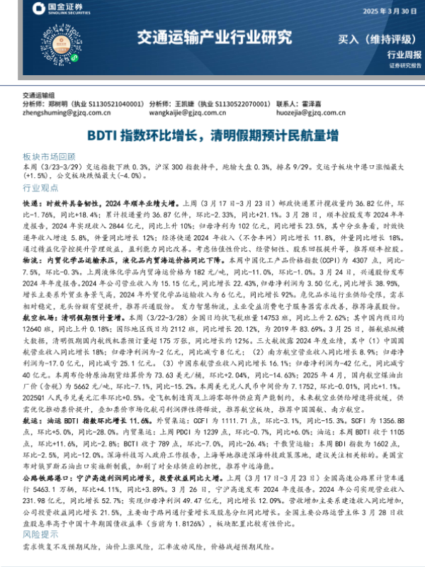 【国金证券】【20250330】国金证券-交通运输产业行业周报:BDTI指数环比增长,清明假期预计民航量增-17页