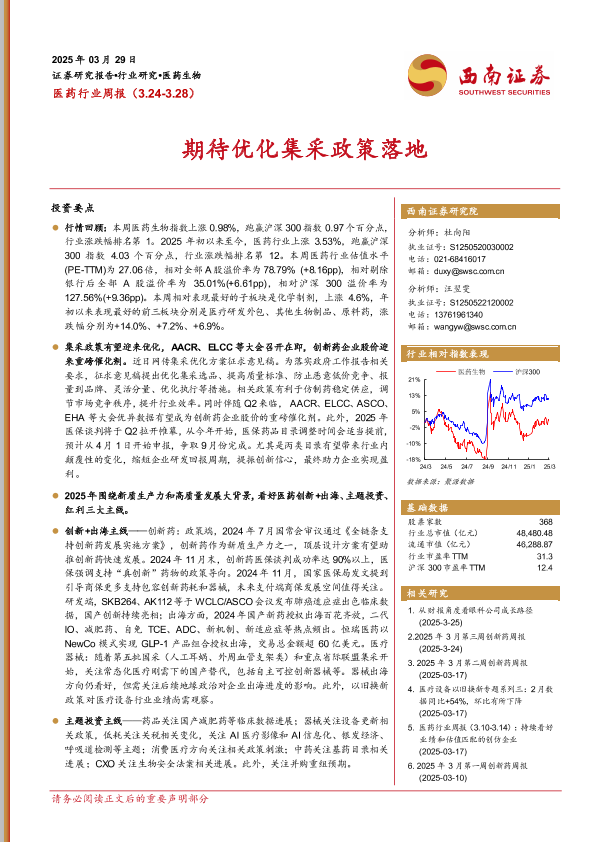 【西南证券】【20250329】医药行业周报:期待优化集采政策落地-34页