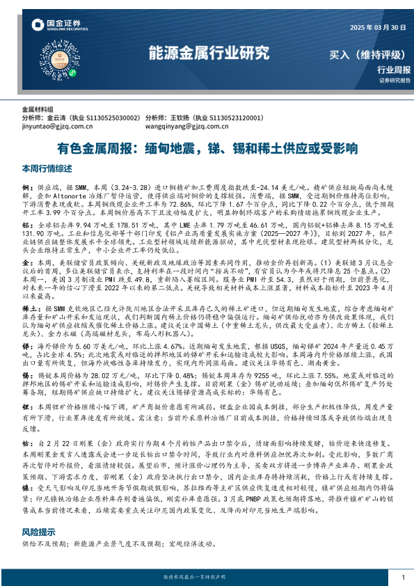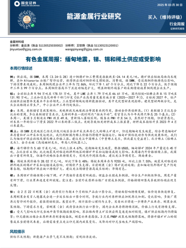 【国金证券】【20250330】20250330-国金证券-有色金属周报:缅甸地震,锑、锡和稀土供应或受影响-20页