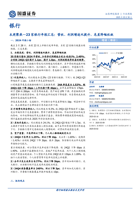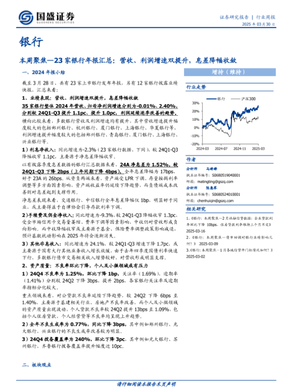 【国盛证券】【20250330】银行本周聚焦:23家银行年报汇总:营收、利润增速双提升,息差降幅收敛-14页