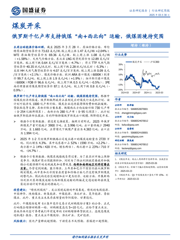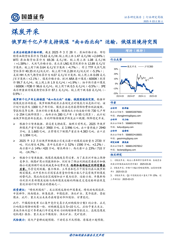 【国盛证券】【20250330】20250330-国盛证券-煤炭开采行业研究简报:俄罗斯千亿卢布支持俄煤“南+西北向”运输,俄煤困境待突围-12页
