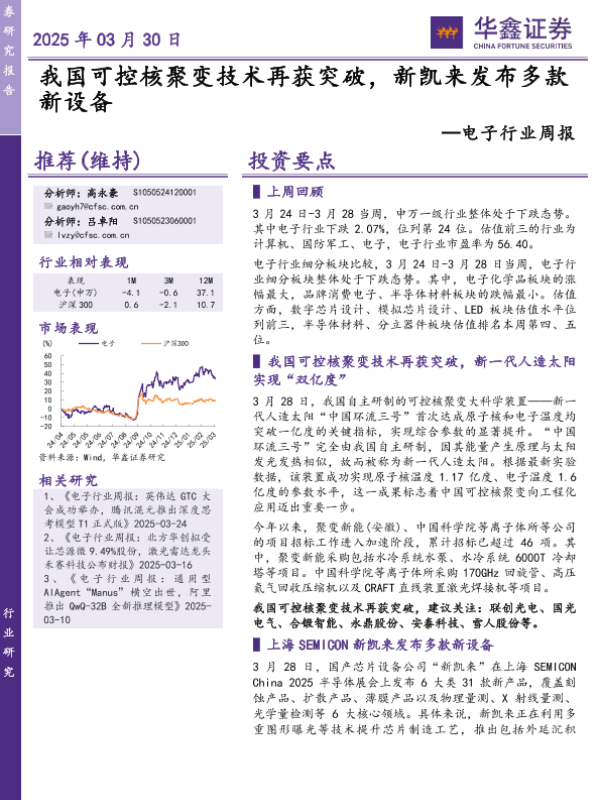 【华鑫证券】【20250330】20250330-华鑫证券-电子行业周报:我国可控核聚变技术再获突破,新凯来发布多款新设备-34页