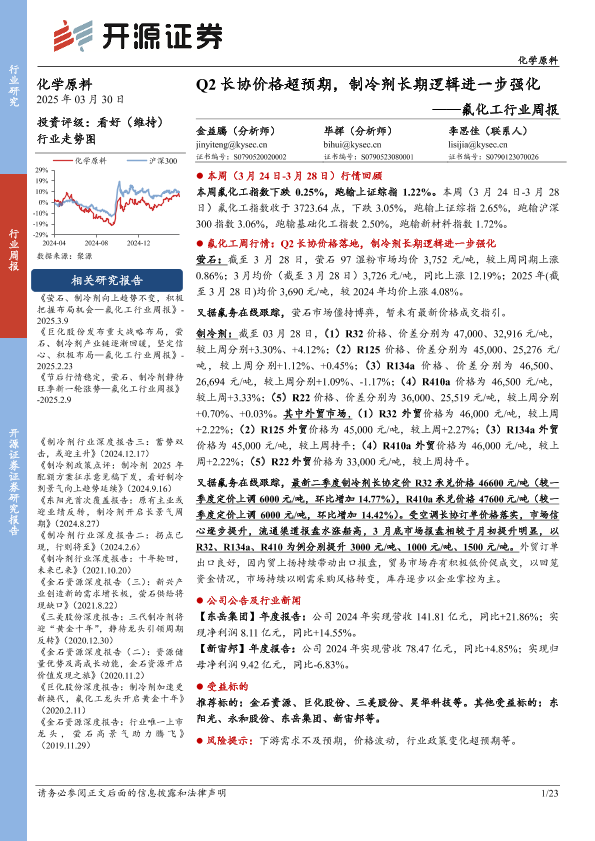 【开源证券】【20250330】氟化工行业周报:Q2长协价格超预期,制冷剂长期逻辑进一步强化-23页