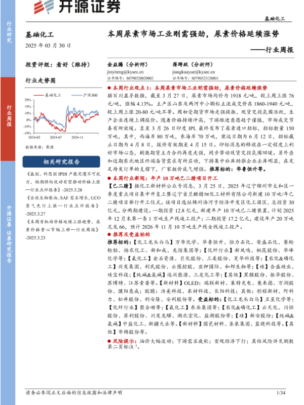 【开源证券】【20250330】基础化工行业周报:本周尿素市场工业刚需强劲,尿素价格延续涨势-34页