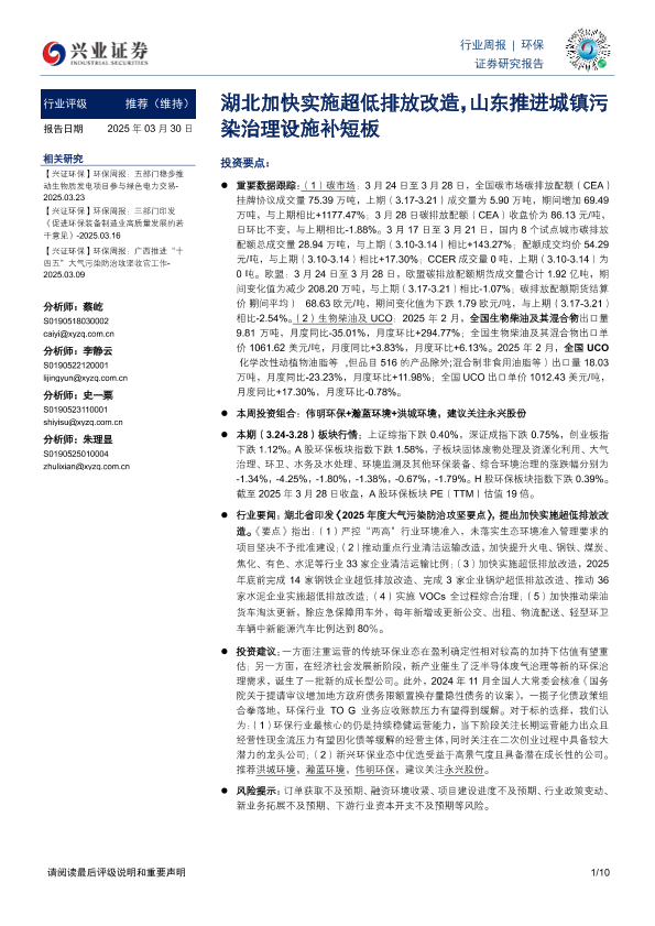 【兴业证券】【20250330】20250330-兴业证券-环保行业周报:湖北加快实施超低排放改造,山东推进城镇污染治理设施补短板-10页