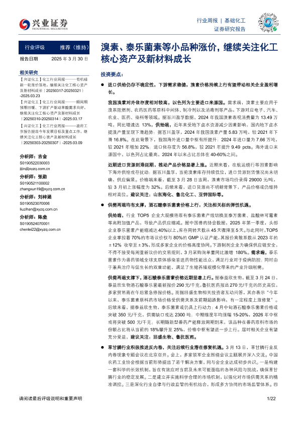 【兴业证券】【20250330】20250330-兴业证券-基础化工行业周报:溴素、泰乐菌素等小品种涨价,继续关注化工核心资产及新材料成长-22页