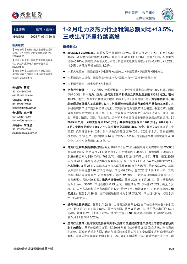 【兴业证券】【20250330】20250330-兴业证券-公用事业行业周报:1-2月电力及热力行业利润总额同比+13.5%,三峡出库流量持续高增-25页