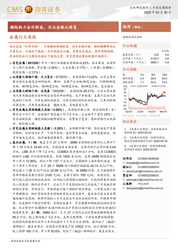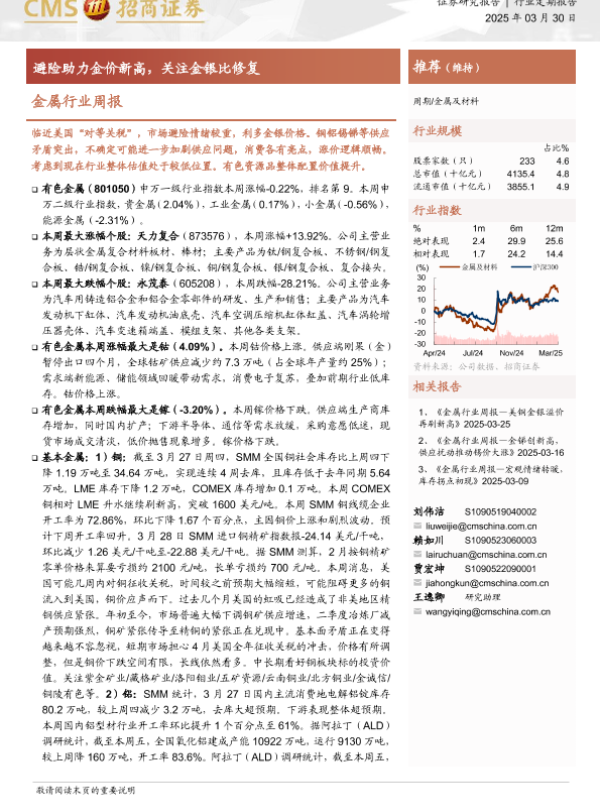 【海通证券】【20250330】金属行业周报:避险助力金价新高,关注金银比修复-16页