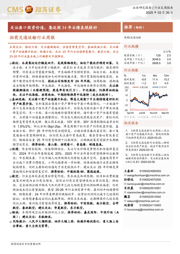 【海通证券】【20250330】招商交通运输行业周报:关注港口投资价值,集运股24年业绩表现较好-15页