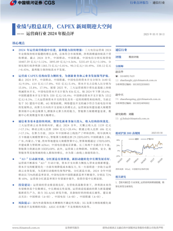 【银河证券】【20250330】运营商行业2024年报点评:业绩与股息双升,CAPEX新周期迎大空间-13页