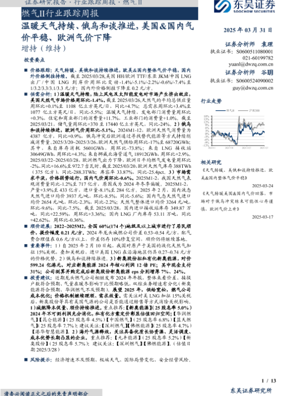 【东吴证券】【20250331】20250331-东吴证券-燃气Ⅱ行业跟踪周报:温暖天气持续、俄乌和谈推进,美国&国内气价平稳、欧洲气价下降-13页