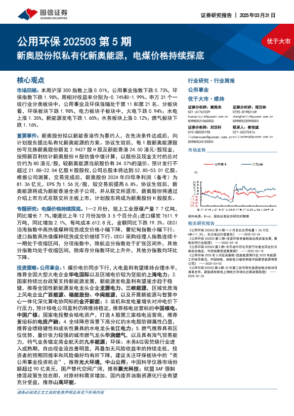 【国信证券】【20250331】公用环保202503第5期:新奥股份拟私有化新奥能源,电煤价格持续探底-29页