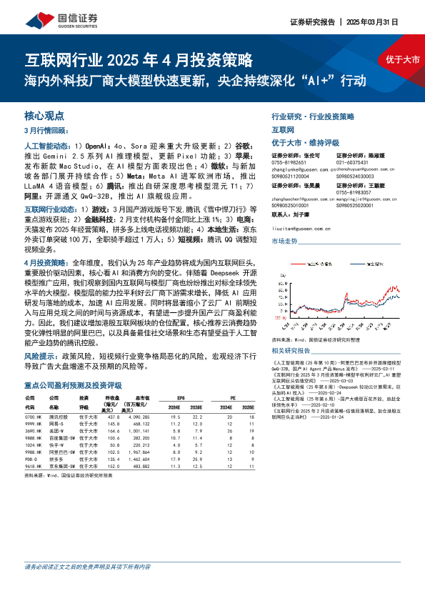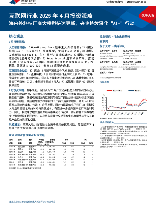 【国信证券】【20250331】互联网行业2025年4月投资策略:海内外科技厂商大模型快速更新,央企持续深化“AI+”行动-18页