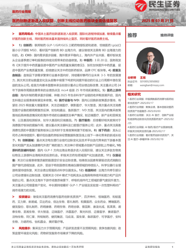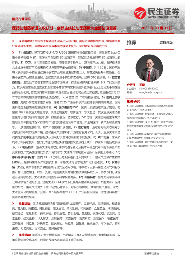 【民生证券】【20250331】医药行业周报:医药创新逐渐进入收获期,创新主线拉动医药板块全面估值复苏-22页