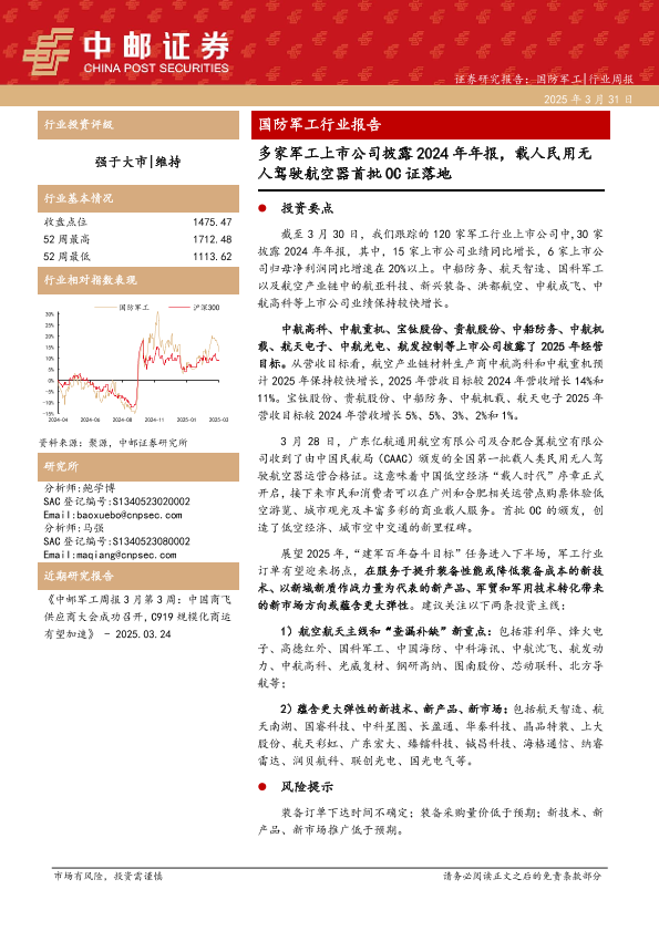 【中邮证券】【20250331】国防军工行业报告:多家军工上市公司披露2024年年报,载人民用无人驾驶航空器首批OC证落地-14页