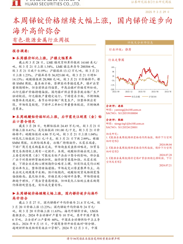 【华西证券】【20250329】20250329-华西证券-有色-能源金属行业周报:本周锑锭价格继续大幅上涨,国内锑价逐步向海外高价弥合-20页