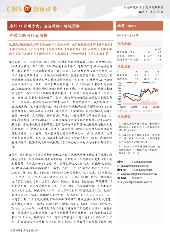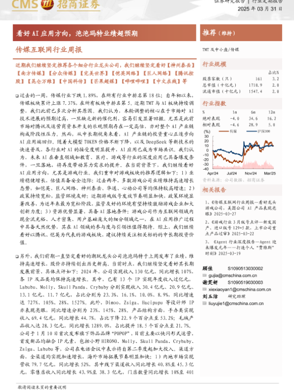 【海通证券】【20250331】20250331-招商证券-传媒互联网行业周报:看好AI应用方向,泡泡玛特业绩超预期-12页
