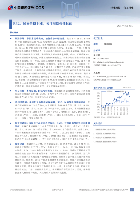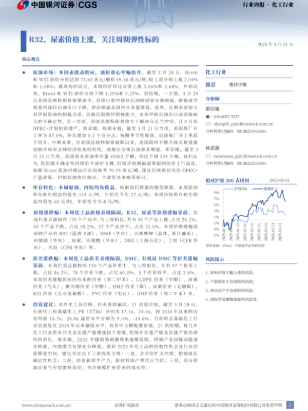 【银河证券】【20250331】20250331-中国银河-化工行业行业周报:R32、尿素价格上涨,关注周期弹性标的-19页