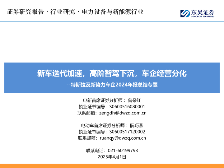 【东吴证券】【20250401】特斯拉及新势力车企2024年报总结专题:新车迭代加速,高阶智驾下沉,车企经营分化-57页