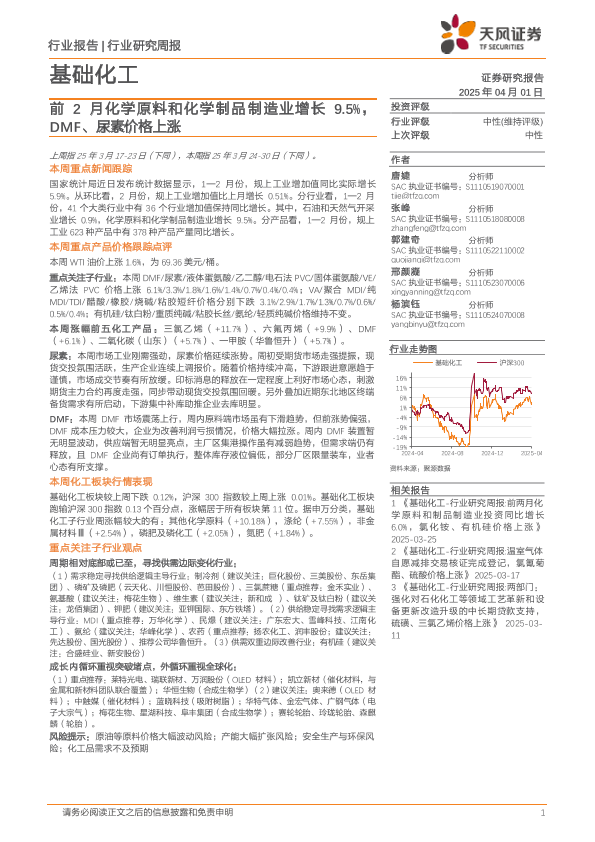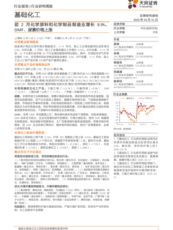 【天风证券】【20250401】基础化工行业研究周报:前2月化学原料和化学制品制造业增长9.5%,DMF、尿素价格上涨-20页