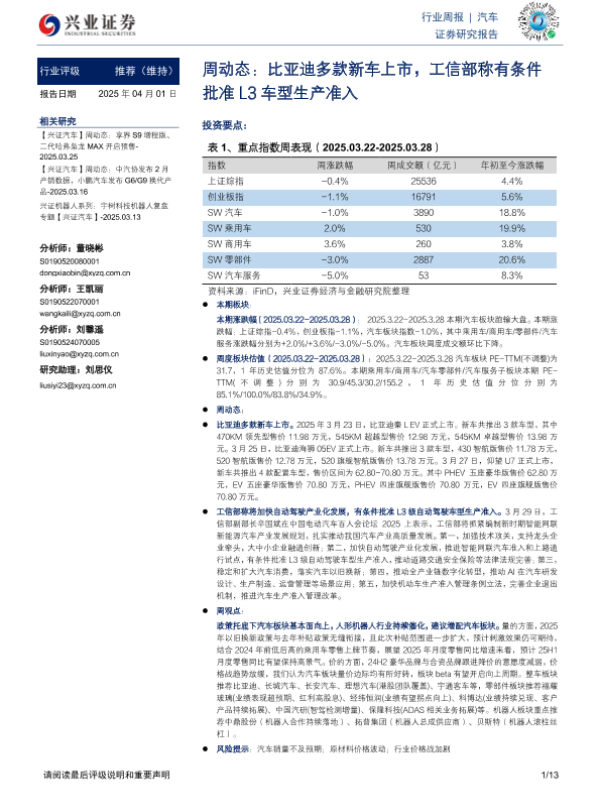 【兴业证券】【20250401】20250401-兴业证券-汽车周动态:比亚迪多款新车上市,工信部称有条件批准L3车型生产准入-13页