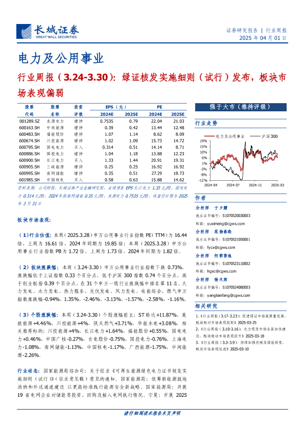 【长城证券】【20250401】20250401-长城证券-电力及公用事业行业周报:绿证核发实施细则(试行)发布,板块市场表现偏弱-13页