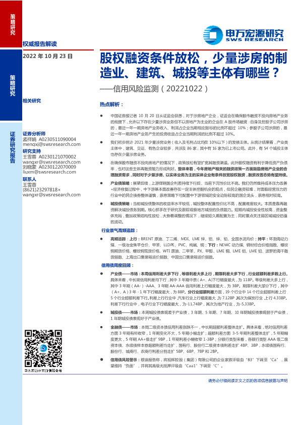 【申万宏源】【20221023】信用风险监测:股权融资条件放松,少量涉房的制造业、建筑、城投等主体有哪些?-16页