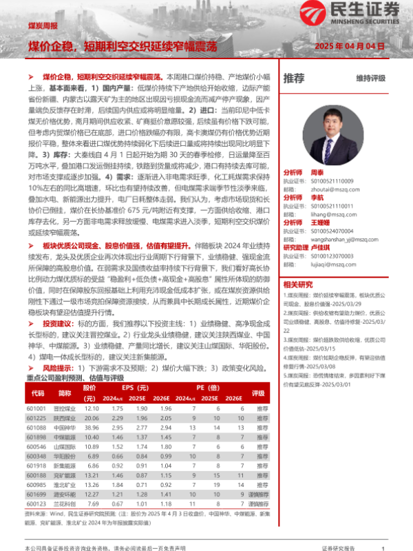 【民生证券】【20250404】20250404-民生证券-煤炭周报:煤价企稳,短期利空交织延续窄幅震荡-22页