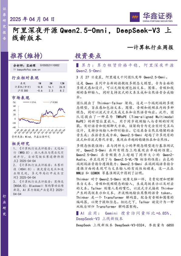 【华鑫证券】【20250404】计算机行业周报:阿里深夜开源Qwen2.5-Omni,DeepSeek-V3 上线新版本-15页