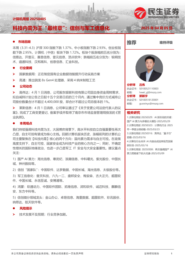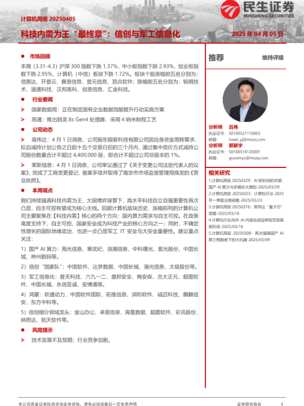 【民生证券】【20250405】20250405-民生证券-计算机周报:科技内需为王“最终章”:信创与军工信息化-13页