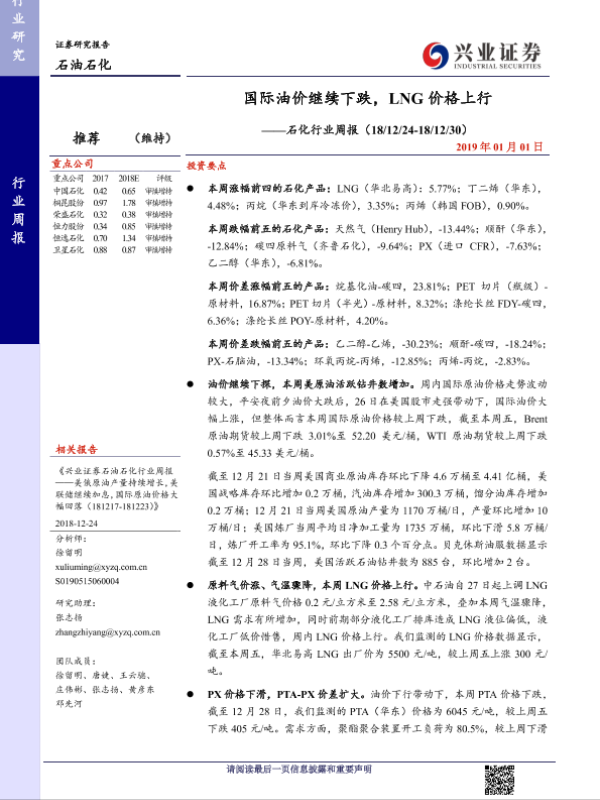 【兴业证券】【20190101】20190101-兴业证券-石化行业周报:国际油价继续下跌,LNG价格上行-12页
