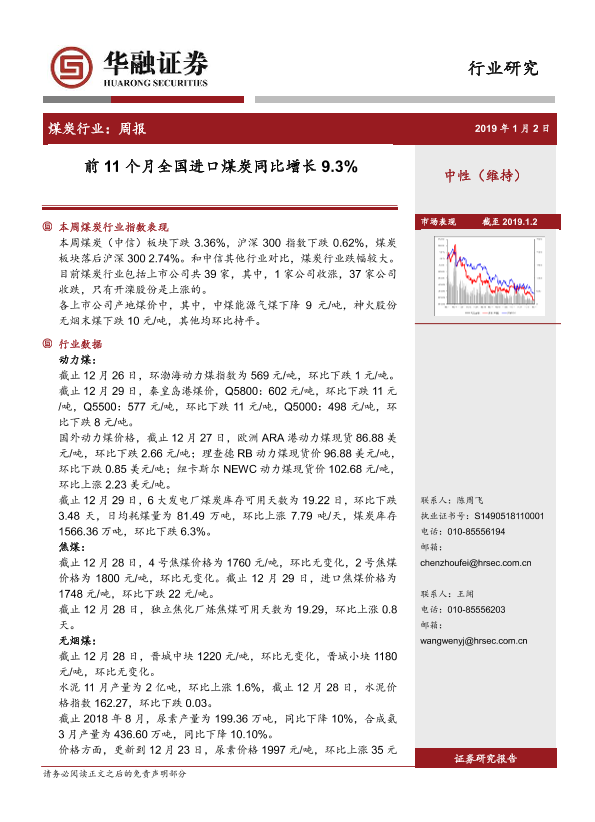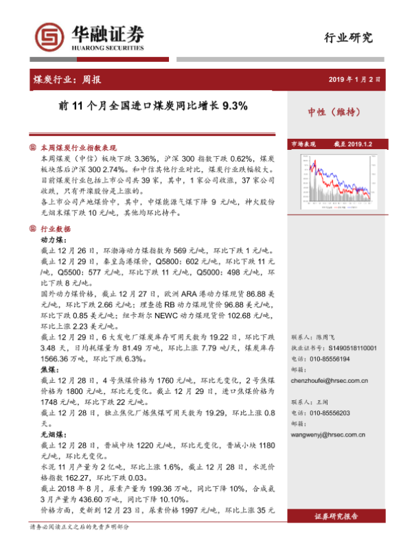 【华融证券】【20190102】20190102-华融证券-煤炭行业:周报:前11个月全国进口煤炭同比增长9.3%-16页