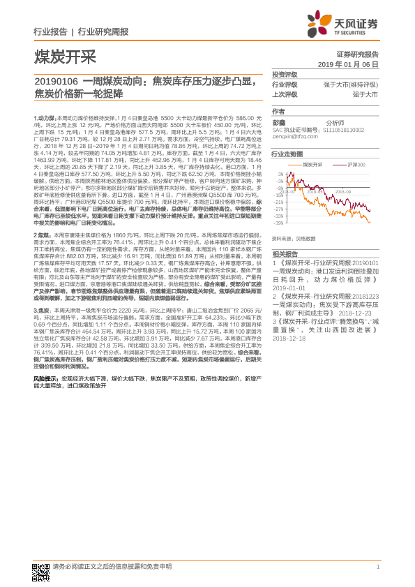 【天风证券】【20190106】20190106-天风证券-一周煤炭动向:焦炭库存压力逐步凸显,焦炭价格新一轮提降-19页