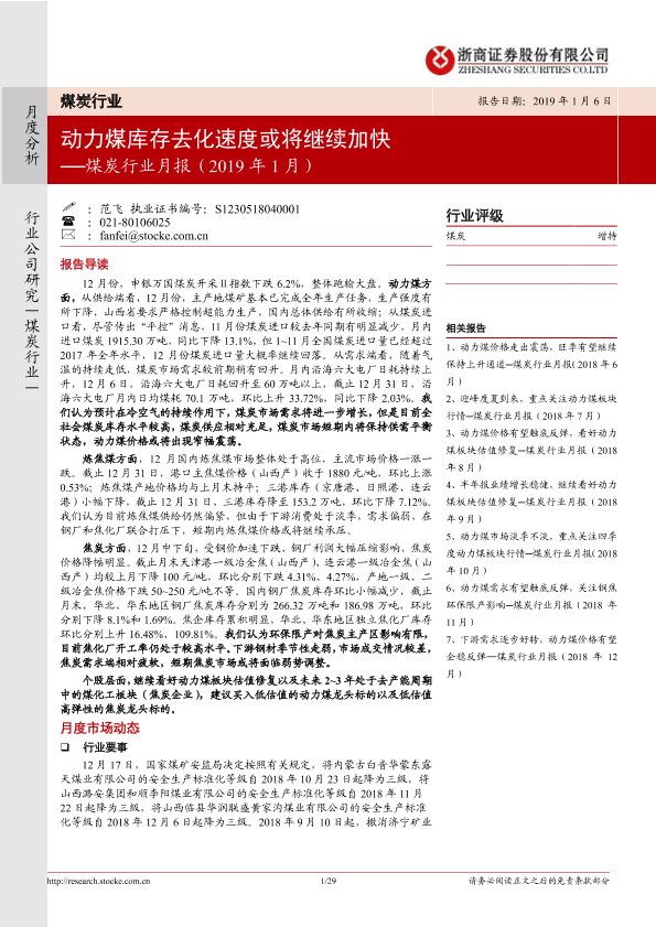 【浙商证券】【20190106】煤炭行业月报(2019年1月):动力煤库存去化速度或将继续加快-29页