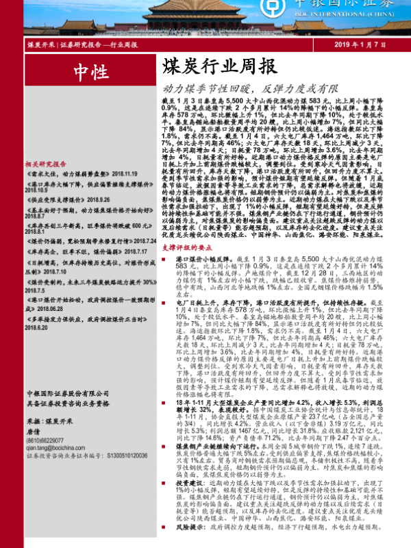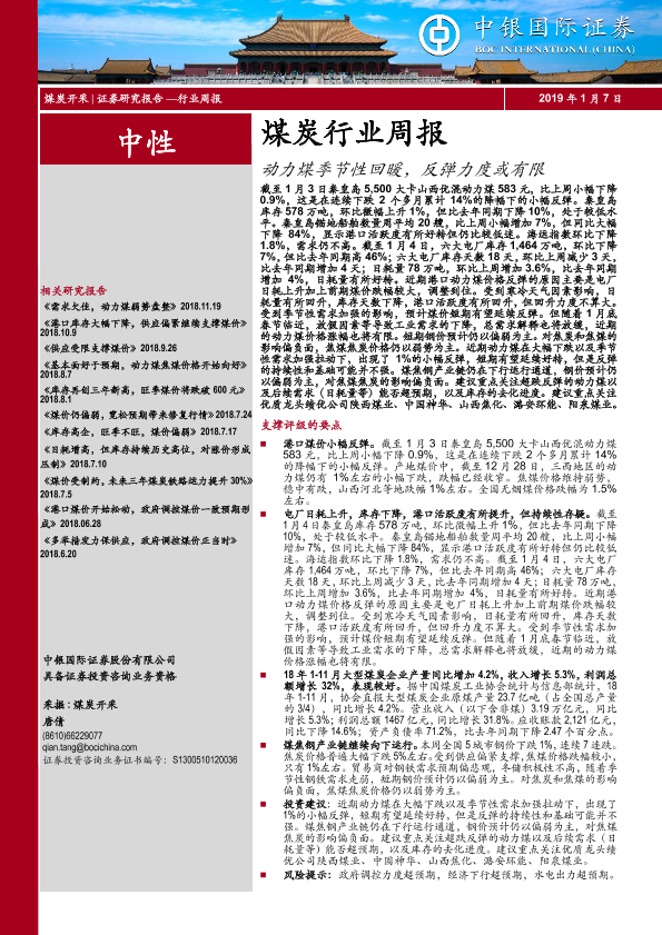【中银证券】【20190107】20190107-中银证券-煤炭行业周报:动力煤季节性回暖,反弹力度或有限-20页
