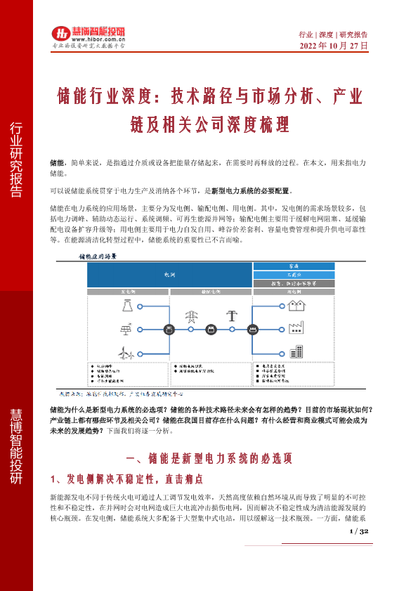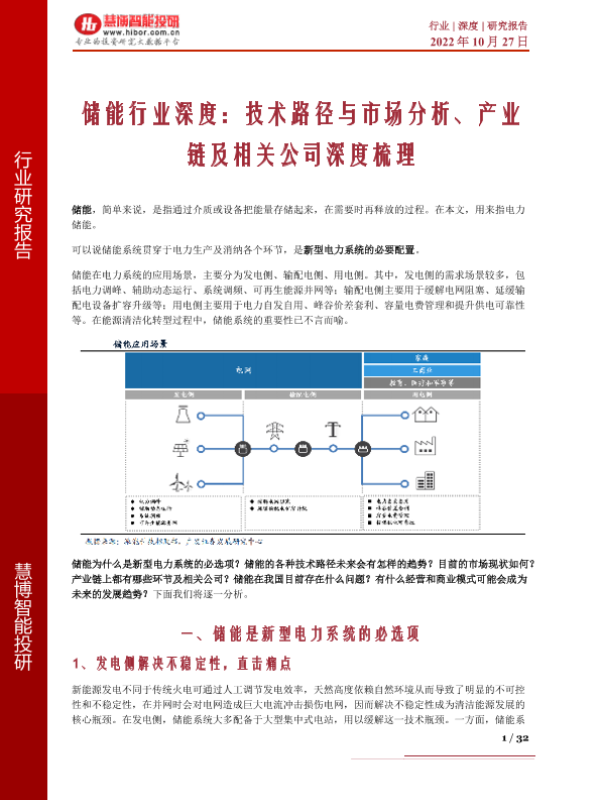 【慧博智能投研】【20221027】储能行业深度:技术路径与市场分析、产业链及相关公司深度梳理-32页