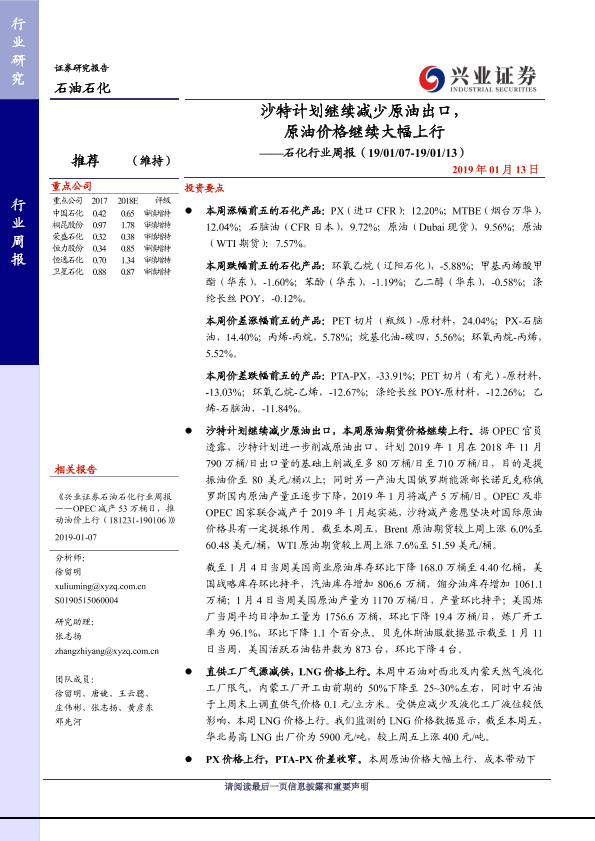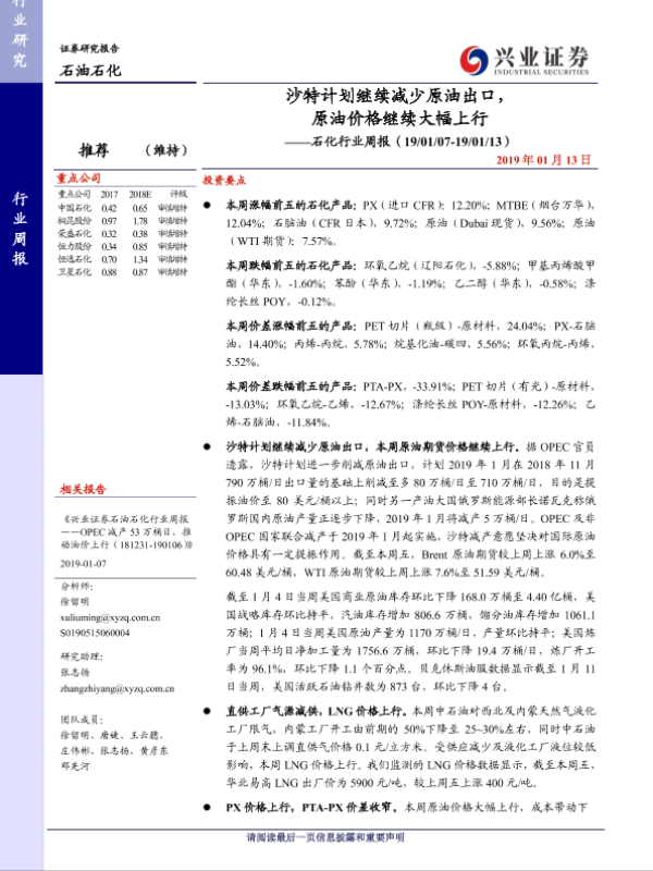 【兴业证券】【20190113】20190113-兴业证券-石化行业周报:沙特计划继续减少原油出口,原油价格继续大幅上行-13页