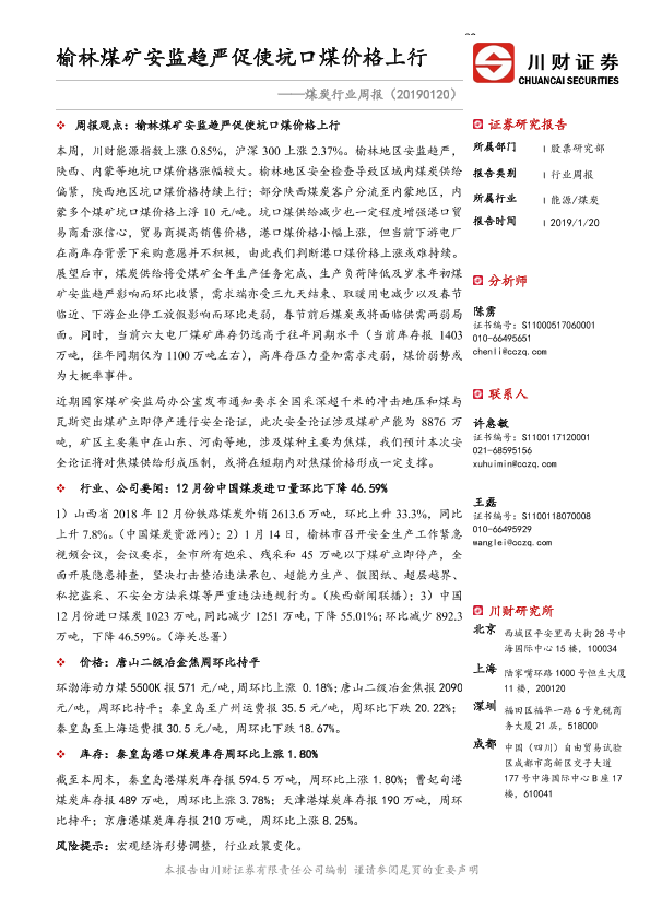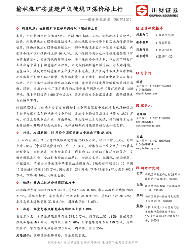 【川财证券】【20190120】20190120-川财证券-煤炭行业周报:榆林煤矿安监趋严促使坑口煤价格上行-15页