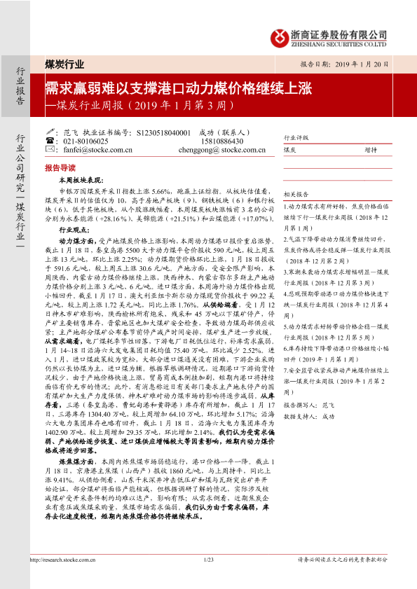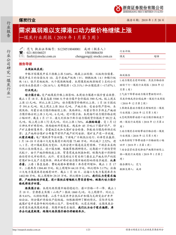 【浙商证券】【20190120】20190120-浙商证券-煤炭行业周报(2019年1月第3周):需求羸弱难以支撑港口动力煤价格继续上涨-23页