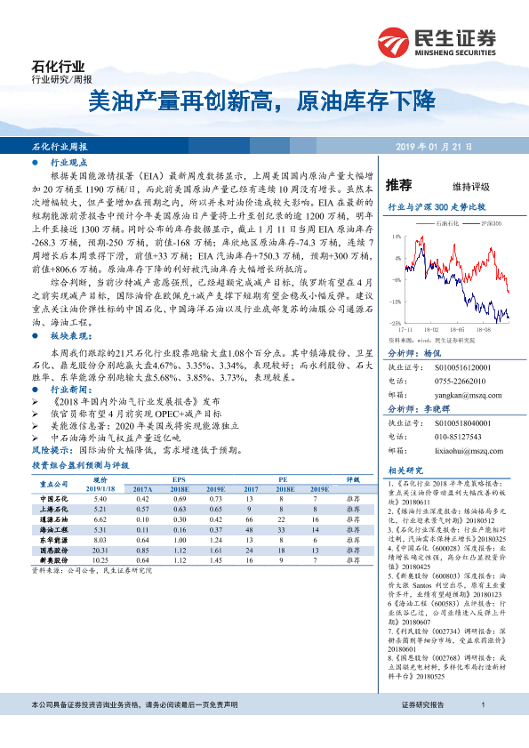 【民生证券】【20190121】20190121-民生证券-石化行业周报:美油产量再创新高,原油库存下降-16页