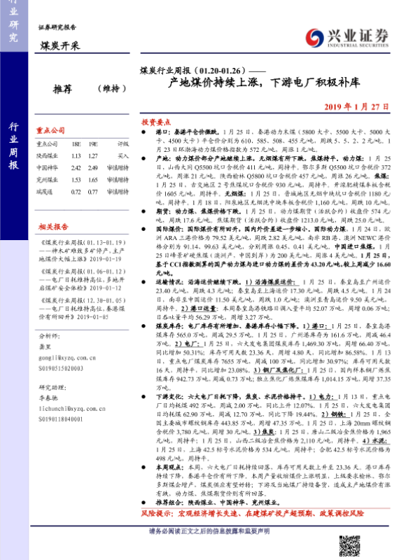 【兴业证券】【20190127】煤炭行业周报(01.20-01.26)——产地煤价持续上涨,下游电厂积极补库-20页
