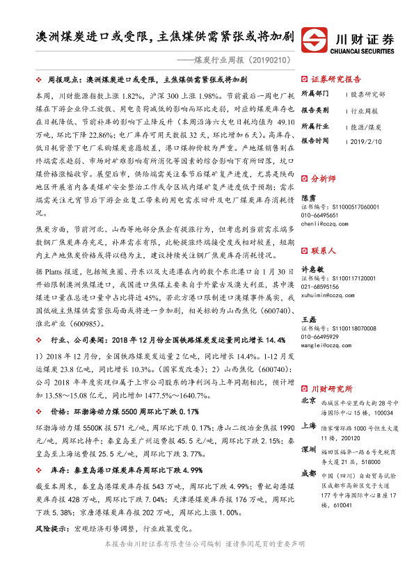 【川财证券】【20190210】20190210-川财证券-煤炭行业周报:澳洲煤炭进口或受限,主焦煤供需紧张或将加剧-16页