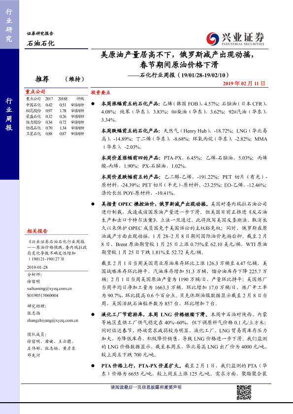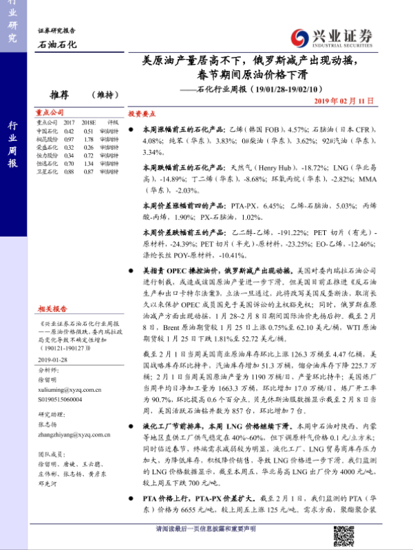 【兴业证券】【20190211】20190211-兴业证券-石化行业周报:美原油产量居高不下,俄罗斯减产出现动摇,春节期间原油价格下滑-12页