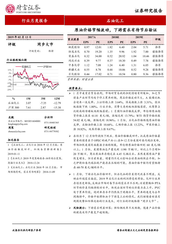 【财信证券】【20190213】石油化工行业月度报告:原油价格窄幅波动,下游需求有待节后验证-10页